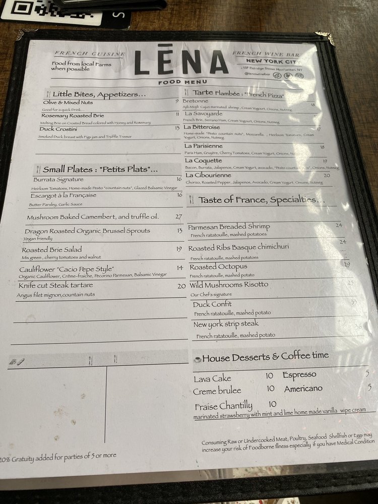 Welcome to Lena L.E.S, nestled in the vibrant Lower East Side of New York City. Here, the menu is a delightful fusion of flavors, showcasing fresh, high-quality ingredients. Start your culinary journey with the Beet Salad, a vibrant dish featuring truffle tremor cheese crumbles, or indulge in the creamy Burrata served with basil pesto and tomatoes. For dessert, don't miss the heavenly Moelleux au chocolat or the luscious Panna Cotta with strawberry coulis, each perfectly crafted to satisfy your sweet cravings.
